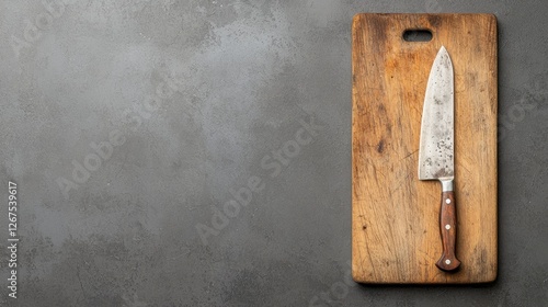 Rustic wooden cutting board with a sharp chef's knife, showcasing kitchen tools on a textured background for culinary and cooking designs