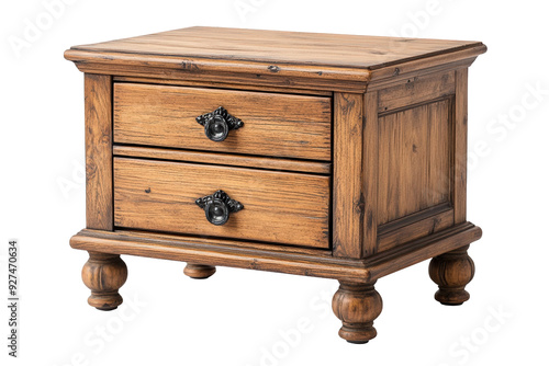 Rustic wooden nightstand with two drawers and decorative handles, perfect for bedroom storage and vintage decor.