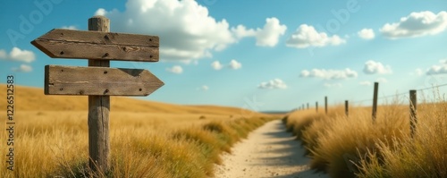 Rustic wooden signpost points down path, weathered wood , trail, guide, sign