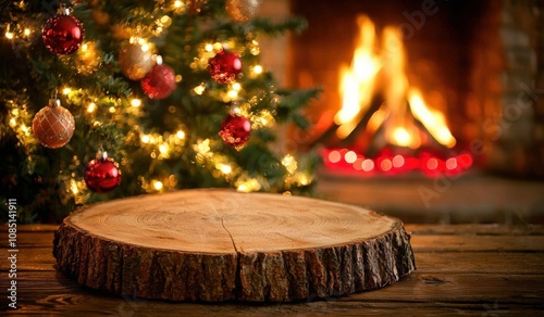 Rustic wooden slice display, Christmas tree and fireplace bokeh background. Perfect for holiday product placement.