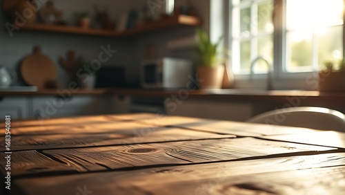 Rustic wooden table bathed in morning sunlight, creating a cozy and inviting kitchen atmosphere.