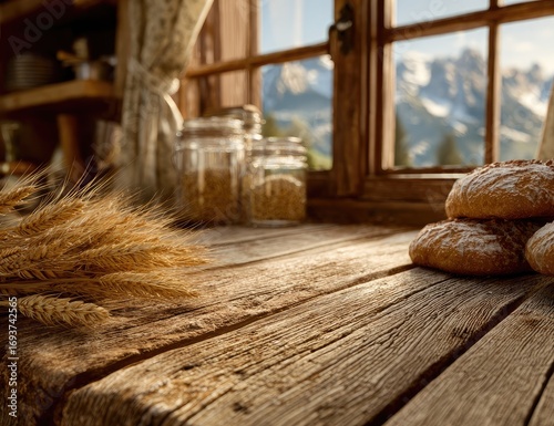 rustic, wooden, table, window, bread, wheat, grain, jar, mountain, sunlight, countryside, kitchen, home, cosy, farmhouse, nature, still life, food, bakery, delicious, fresh, organic, natural, warm, brown, gold, simple, country, morning, light, peaceful, vintage, aged, earthy, texture, detail, sharpened, closeup, depth, composition, balanced