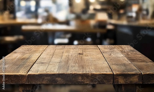 Rustic wooden table top in blurred cafe background.