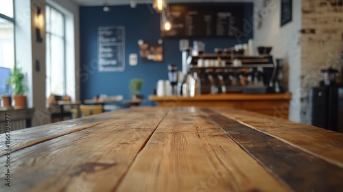 Rustic Wooden Table with Coffee Shop Ambience in Background Creating Warm and Inviting Atmosphere for Relaxation and Socializing