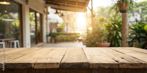 Rustic Wooden Tabletop Displaying a Sunlit Outdoor Cafe Setting