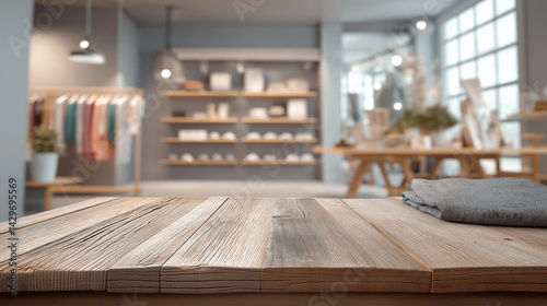 Rustic Wooden Tabletop in Blurred Clothing Store