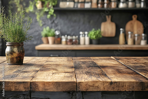 Rustic Wooden Tabletop with Herbs, Blurred Kitchen Background - Stock Photo