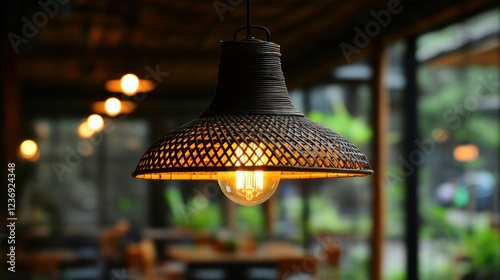 Rustic woven pendant lamp in cafe, blurred background of tables and greenery