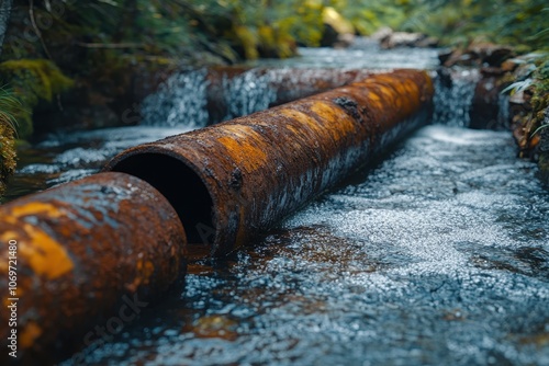 Rusty pipe in a flowing stream. Represents the impact of pollution on nature.