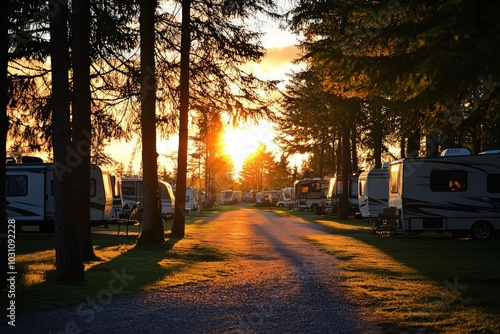 RV park captured at sunset, highlighting the calm and the silhouetted trees.