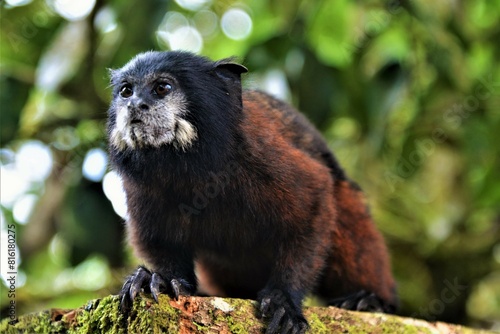 Saddle-back tamarin (Callitrichidae family) in the Amazonian rainforest near the confluence of the rivers Rio Puyo and Pastaza (Amazonia, Ecuador)
