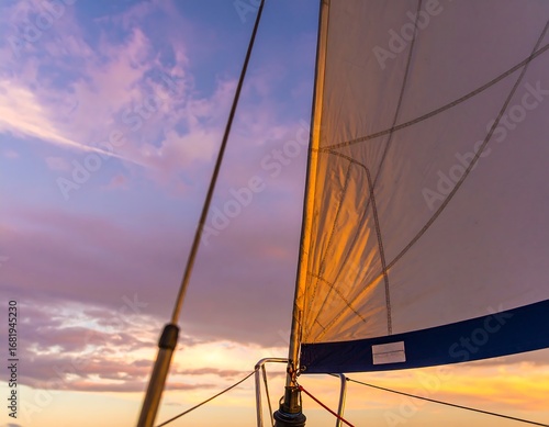 sail, sunset, cloud, sky, sailboat, sailing, boat, wind, ocean, sunrise, orange, purple, pink, gold, light, fabric, evening, water, colours, horizon, detail, perspective, angle, closeup, top, view, mast, rope, rigging, texture, canvas, bright, nature, travel