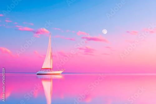 Sailboat at sunset with full moon rising over ocean