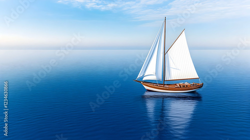 Sailboat glides across calm ocean, peaceful seascape; travel, vacation imagery