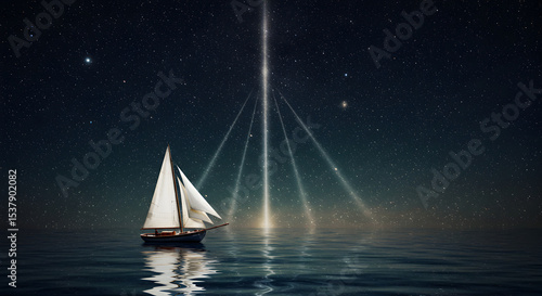 Sailboat sailing under a starry night sky with lights coming from the sky