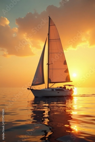 Sailing boat in the golden hour with sails full, golden hour, sun