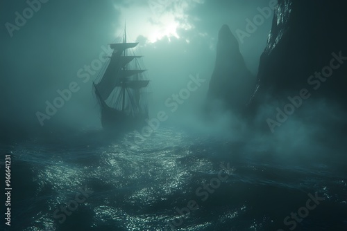ship, sailing, ocean, fog, mist, sea, water, sky, dark, silhouette, wave, stormy, horizon, rocky, cliff, coastline, journey, adventure, travel, nautical, marin, nature, fantasy, mystery, exploration, old, vintage, historic, blue, moonlight, night, deep, dramatic, digital, art, realistic, illustration