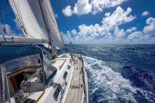 sailing, boat, yacht, ocean, sea, water, wave, blue, white, sky, cloud, sun, sunshine, navigation, deck, nautical, voyage, travel, adventure, cruise, maritime, wind, sail, vessel, horizon, summer, vacation, holiday, view, landscape, sport, equipment, trip, day
