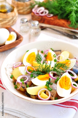Salad of herring, boiled potatoes, eggs and onions with olive oil.
