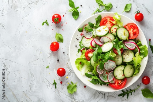 Salad with fresh summer vegetables on white table. Top view with copy space. AI Generated