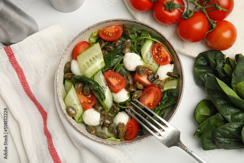 Salad with vegetables, capers and mozzarella in bowl on white table, flat lay