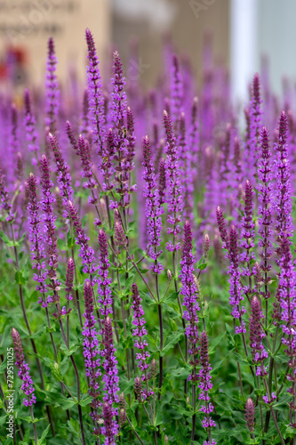 Salvia nemorosa the woodland sage beautiful bright color purple blue flowers in bloom, Balkan clary flowering plants in garden