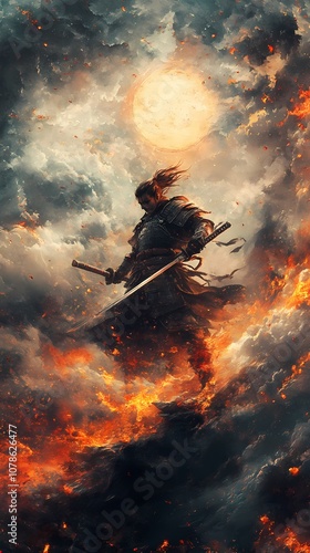 samurai, warrior, sword, fire, sky, cloud, sun, fantasy, battle, storm, art, digital, painting, illustration, hero, japan, culture, mythology, legend, action, power, strength, determination, courage, anger, glory, epic, dramatic, dynamic, intense, fiery, dark, light, contrast, gold, orange, black, grey