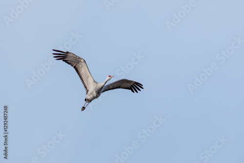 飛翔する美しく大きなカナダヅル(ツル科) 英名学名:Sandhill Crane, Grus canadensis 栃木県栃木市渡良瀬遊水地-2025