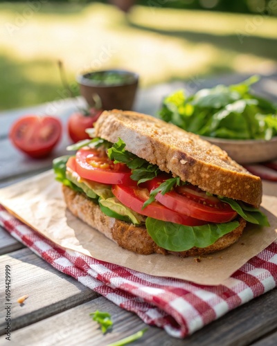 sandwich, vegetable, tomatoes, lettuce, greener, table, wooden table, bread, rye bread, brown bread, food, lunch, healthy, fresh, ingredient, clothes, red, white, bowl, green, outdoors, park, grain, slice, picnic, tablecloth, deli, arugula, spinach, avocado, filling, vegetarian, herb, dip, chequered, textile, rustic, country style, afternoon, summer, shadow, sunlight