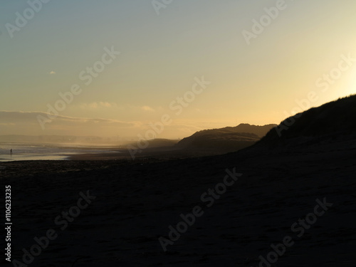Sandy beach and walkers in the distance with back light in Balmedie - Aberdeenshire - Scotland - UK