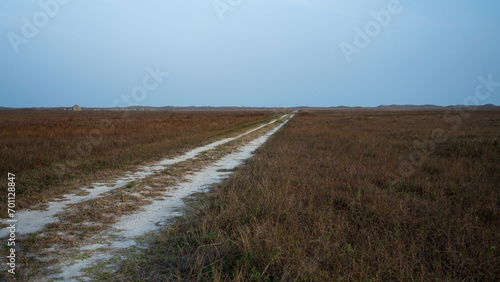Sandy trail path leading to the horizon through the grass on barrier island of the Gulf coast on cloudy day concept of road less traveled or broken road