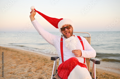 santa, christmas, sea, warmth, sand, sun, winter, summer, sunglasses, relax, chaise longue, grimace, armchair, to sit, new year, holiday, vacation, suspenders, beard, enjoy, happiness, holiday maker, tropical, season, travel