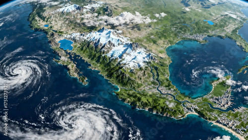 Satellite view of earth showing mountain ranges cities and hurricanes swirling above blue ocean atmosphere