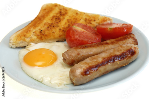 sausage, pork meat, fried, grilled, egg, tomatoes, tomatoes, buttered, toast, toasted, slice, sliced, bread, plate, breakfast