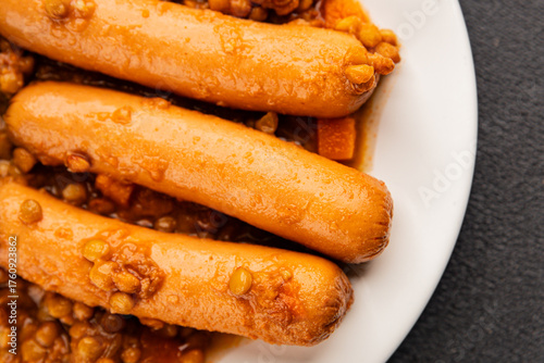 Sausage with lentils second course tasty snack fresh delicious gourmet food background on the table rustic top view copy space