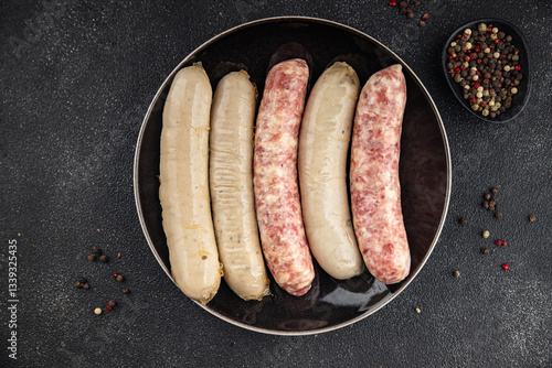 Sausages raw meat pork, beef, chicken, lamb fresh tasty food dish gourmet food background on the table rustic food top view copy space