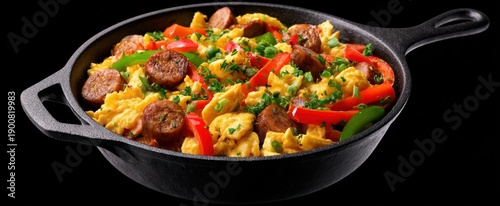 Savor a hearty brunch skillet bursting with scrambled eggs savory sausage and colorful sautéed bell peppers