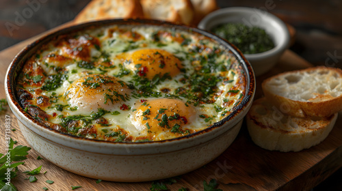 Savory Baked Eggs in Pan With Herbs and Spices Close-Up