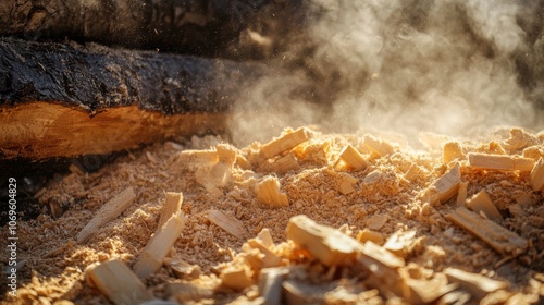 Sawdust from woodworking falls on the forest floor, illuminating the area , Generative AI