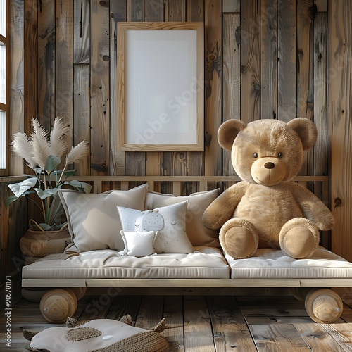 Scandinavian farmhouse style beige living room interior with natural wooden furniture. Mock up frame on wall background. 3d render illustration.