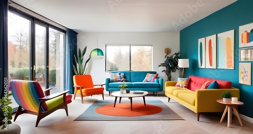 Scandinavian interior design from the mid-century, with vibrant rainbow furniture in a modern living room.