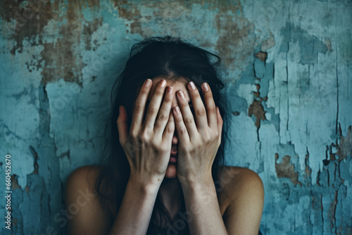 Scared, Depressed person, woman hiding with hands covering her face