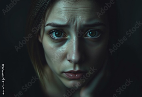 state, face, emotional, seated, clean, scared, forehead, dark, effect, pale, photorealistic, composition, anxiety, dimly, female, fear, portrait, high, background, realism, blurred, gradient, room, minimalist, circle, lit, perspiring, detail, people, human