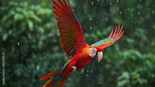 Scarlet Macaw in Flight with Vibrant Plumage Against Lush Green Backdrop