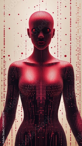 Scarlet vibrant quantum dots forming a striking human silhouette over a soft cream backdrop wallpaper background vertical design concept