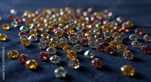 Scattered Gemstones on Dark Fabric - Colorful gemstones scattered on a dark blue fabric background. Sparkling and luxurious