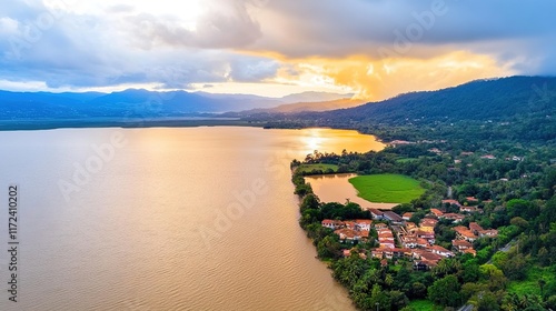 sunset, lake, aerial view, landscape, nature, scenic, water, tree, mountain, village, countryside, cloud, peaceful, environment, beauty, scenic view, tranquil, horizon, rural, sunlight, serene, geography, sky, panoramic, ecosystem, agriculture, field, vegetation, river, natural, wilderness, calm, travel, adventure, scenic beauty, exploration, relaxation, summer, clear sky, biodiversity, destination, tour tourism, travel destination, panorama, habitat