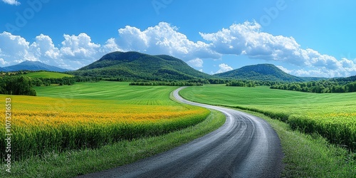 Scenic and Serene Countryside Landscape Featuring Lush Green Fields, Rolling Hills, and a Winding Road Under a Bright Blue Sky with Fluffy White Clouds