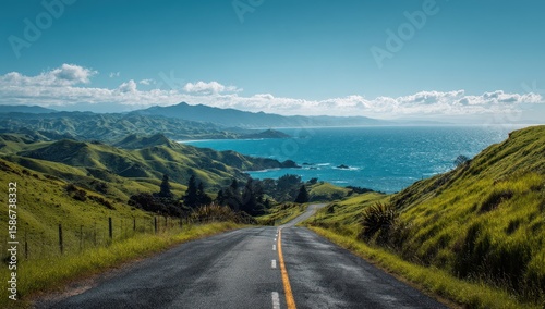 Scenic coastal road winding through lush hills