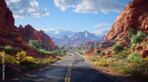 highway, road, desert, canyon, red rock, mountain, landscape, nature, scenic, drive, travel, adventure, rock formation, flora, wildflower, spring, summer, sunshine, cloud, open road, journey, vista, panorama, southwest, us, rock, vale, sunlight, asphalt